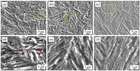 SEM micrographs of experimental steels subjected to the heat treatment processes in Figure 1c. (a,d) Variant A; (b,e) variant B; (c,f) variant C; (d–f) the corresponding partial enlargement (yellow square) micrograph.
