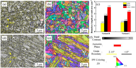 EBSD results of variants B and C. (a,d) Combined map of the band contrast image and boundary distribution map; (b,e) Combined map of the inverse pole image and boundary distribution map; (c) boundary length per unit area; (f) the corresponding legends; (a,b) Variant B; (d,e) Variant C.