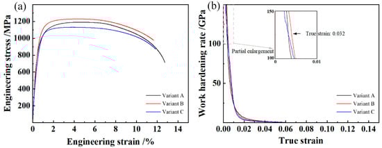 The tensile properties and mean hardness are shown in Table 3, and the corresponding tensile curves are shown in Figure 6. The strength of Rp0.2 is determined as the yield strength (YS). High-strength tensile properties were obtained, with a combination of YS, UTS, and TEL exceeding 830 MPa, 1130 MPa, and 11.6%, respectively. Due to the high thermal stability of prior austenite, phase transformation during the air-cooling stage following austenitization and isothermal heat treatment was completely inhibited. As a result, undercooled austenite transformation occurred only during the final cooling process. Therefore, the lath martensite matrix was formed. In variant B, a refined martensite matrix was observed due to the lower austenitization temperature of 950 °C and the use of water quenching in the final cooling stage. The supersaturated C atoms in martensite exist in the form of the interstitial solid solution, resulting in a significant lattice distortion. The dislocation interaction was more severe at the initial plastic deformation stage, resulting in a higher work-hardening rate, as shown in Figure 6b. In variant A, the strength and Vickers hardness decreased due to the recovery of preferentially transformed martensite during the air-cooling process. For variant C, the coarse microstructure and relatively lower boundary length per unit area were obtained, leading to a decrease in strength and hardness.