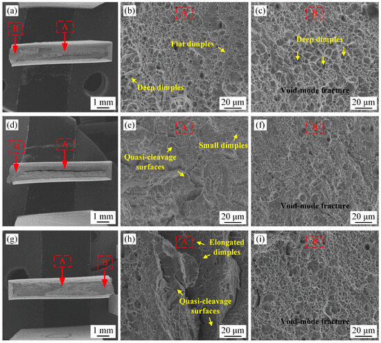 Tensile fracture morphology of experimental steel (a–c) Variant A; (d–f) variant B; (g–i) variant C; (a,d,g) facture macrostructure; (b,e,h) zone A; (c,f,i) zone B.
