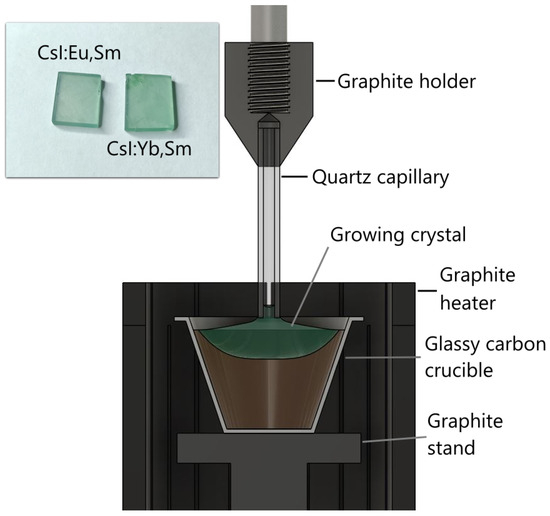 The growth setup comprised a spherical water-cooled stainless steel chamber. A crystal pulling rod, thermostatically water-cooled and driven by two stepper motors, provided simultaneous rotation and vertical displacement of the growing crystal. A graphite adapter fitted with a quartz capillary was mounted at the rod’s extremity (Figure 1). The furnace was equipped with a cylindrical resistive heater surrounded by pyrolytic graphite thermal insulation. Temperature regulation was achieved using a K-type thermocouple attached to the crucible base. Granulated CsI with a purity of 99.998% (with respect to metal impurities), produced by Lanhit, was used as the starting material for crystal growth. The activators consisted of and powders, as well as granulated , all with a purity of 99.99% (Lanhit). The initial mixture contained 150 g of CsI and 2.6 g of each activator (approximately 1 mol%). The materials were loaded into a vitreous carbon crucible inside the furnace and heated under vacuum at 500 °C for six hours to remove adsorbed oxygen and moisture. By the end of the drying process, the residual vapor pressure in the furnace was below 0.01 Pa. To suppress melt evaporation, both melting and crystal growth were conducted in an argon atmosphere maintained at 110 kPa.