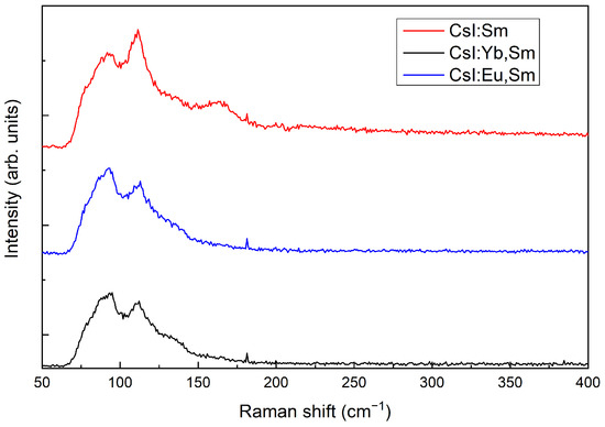 The undoped crystal does not exhibit Raman scattering as a result of its NaCl-type crystal lattice. However, Raman signals were detected in CsI crystals doped with 1 mol% of and , as well as in those doped with 1 mol% of and 1 mol% of . The Raman spectra of these doped crystals are presented in Figure 2. The bands observed at 80, 94, 112, 136, and 164 cm−1 in the doped crystals can be attributed to “(Ln2+I8)6−-vacancy” clusters [19].