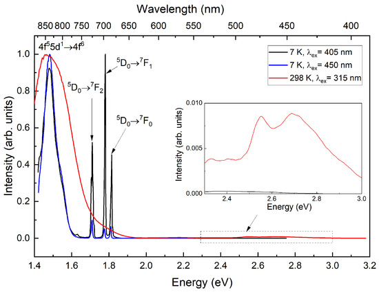 The luminescence spectra of CsI:Yb,Sm shown in Figure 3 were measured at temperatures of 298 K and 7 K. At room temperature, a band corresponding to the 4f55d1→4f6 luminescence of divalent samarium [20] is observed in the red and infrared spectral regions, with a maximum intensity in the range of 1.4–1.5 eV (≈827–886 nm) under 405 nm laser excitation. In the blue spectral region under 3.94 eV (≈315 nm) Xe-lamp excitation at room temperature, two bands (high-spin and low-spin) of 4f135d1→4f14 luminescence from divalent ytterbium ions are visible [21]. However, the emission intensity in these bands is two orders of magnitude lower than that of the divalent samarium band. In the long-wavelength region, the edge of the 4f55d1→4f6 emission band is truncated due to the declining sensitivity of the detector used. The excitation wavelength of 315 nm indicated in the figure was specifically selected to measure the short-wavelength edge of the ytterbium bands. When using 405 nm laser excitation, the spectral shape of the samarium bands remains unchanged.