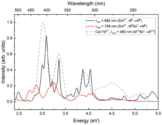 The excitation spectrum (Figure 4) consists of transitions of Yb and Sm ions. In the region of transitions of samarium, the main excitation bands show good agreement with the excitation bands of the CsI:Yb reference sample [13]. In the emission band of samarium ions, the excitation spectrum exhibits some anticorrelation compared to the excitation spectrum of luminescence, suggesting different types of samarium emission centers responsible for and luminescence.