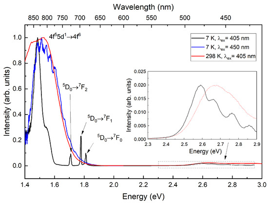 Upon cooling, the characteristic Yb2+ emission band nearly completely loses its intensity, while the 4f55d1→4f6 emission band narrows, revealing a shoulder at 1.55 eV (≈800 nm). Additionally, 4f6→4f6 luminescence bands characteristic of divalent samarium ions appear [22,23], with observed transitions 5, 5 and 5 showing maxima at 1.81 eV (≈685 nm), 1.77 eV (≈700 nm), and 1.71 eV (≈725 nm), respectively. When excited at 450 nm within the ytterbium emission band, the intensity of the emission increases significantly, relative to the transitions.