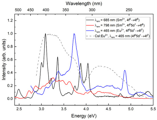 The excitation spectrum (Figure 6) of CsI:Eu,Sm in the luminescence band is completely identical to that of CsI:Yb,Sm in the band. When excited within the luminescence band of Sm ions, a correlation with the excitation spectrum of ions is observed. From the luminescence spectra, it is evident that both Eu and Yb act as sensitizers for ions.