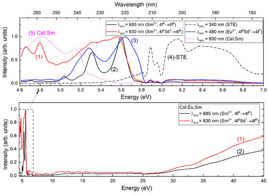 From the excitation spectra of crystals with double activation (Figure 6 and Figure 7), it is evident that excitation transfer from the divalent ions of the sensitizers or to occurs. In particular, in crystals activated by europium, bands appear in the 5d-4f excitation spectrum in the 5.3 and 5.6 eV regions, associated with the excitation of a near-impurity exciton near europium [15] and weak bands in the region associated with self-trapped excitons at 5.9–6.0 eV. A similar pattern is observed in CsI-Yb,Sm crystals.