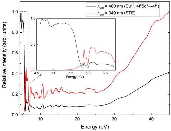 The excitation spectrum of CsI:Eu,Sm in the vacuum ultraviolet (VUV) region was measured in the and emission bands at 7 K (Figure 7, curves (1) and (2)). A correlation is observed between the high-energy excitation spectra. In the 5–5.9 eV (≈248–210 nm) range, the excitation spectrum exhibits two bands with maxima at 5.3 eV (≈234 nm) and 5.6 eV (≈221 nm), showing good correlation with the excitation spectrum of europium emission. In contrast, the band displays a broad continuum without characteristic dip. Notably, these excitation bands are absent in the excitation spectrum of CsI:Sm (Figure 7, curve (5)). In the STE excitation region, the and crystals are not found intensive bands. However, STE-like excitation band structures can be observed (Figure 7, curves (2) and (3)). In contrast, CsI doped with only is not excited in the STE region (Figure 7, curve (5)). The excitation spectrum in the band of CsI:Eu (Figure 8) correlates with the STE excitation spectrum, indicating an efficient energy transfer mechanism from self-trapped excitons to ions.