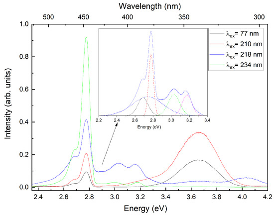 For a more detailed study of the divalent europium luminescence band, we measured the luminescence spectra of CsI:Eu crystals at 7 K under excitations at 5.6 eV (≈221 nm), 5.7 eV (≈218 nm), 5.3 eV (≈234 nm), and 3.7 eV (≈335 nm) (Figure 9). The Gaussian fitting analysis of the emission band demonstrated that the spectrum consisted of five overlapping components with maxima at 2.69 eV (≈461 nm), 2.73 eV (≈454 nm), 2.78 eV (≈446 nm), 3.03 eV (≈409 nm), and 3.17 eV (≈391 nm). The relative intensities of these bands showed significant variation with increasing excitation energy. Furthermore, the spectrum contained an additional luminescence peak at 3.66 eV (≈339 nm) corresponding to self-trapped exciton emission.