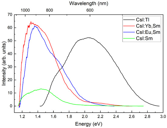 Red-emitting scintillators represent a crucial class of materials capable of converting ionizing radiation energy into red and near-infrared luminescence. These materials are of significant interest for radiation monitoring, medical imaging, and high-energy physics, as their spectral characteristics closely match the sensitivity range of semiconductor photodetectors. Ultra-compact yet highly sensitive scintillator–photodetector assemblies could be particularly valuable for real-time dosimetry monitoring during radiation therapy [1,2,3,4]. Traditional scintillator materials often rely on trivalent rare-earth ions as activators; however, divalent samarium () has emerged as a promising alternative for NIR emission [5,6]. exhibits characteristic 5d→4f transitions that result in strong emission in the red and NIR regions, making it suitable for applications requiring efficient light conversion at these wavelengths. Additionally, divalent samarium exhibits low self-absorption, which contributes to high light yield even at high activator concentrations [7]. However, the practical application of -activated scintillators can be limited by the need for efficient energy transfer mechanisms [8,9,10]. To address these limitations, sensitization strategies involving co-doping with other rare-earth ions such as ytterbium () [6,11] or europium () have been explored [9,12]. and can act as efficient sensitizers, absorbing energy from the host lattice and transferring it to via energy transfer processes, thereby enhancing the overall scintillation efficiency. Our previous studies [13,14] of activated CsI single crystals have revealed that while samarium ions exhibit efficient red emission through transitions, their practical application is limited by poor spectral overlap between the host exciton emission band and absorption. Therefore, the luminescence of exhibits low intensity under X-ray excitation. However, co-doping with suitable sensitizers can enhance energy transfer and increase X-ray-excited luminescence. The optimal impurities for this co-doping strategy are and , as the energy transfer processes involving these activators are relatively efficient [13,15]. This article focuses on the development and characterization of novel scintillator materials based on CsI crystals activated with divalent samarium () and sensitized with ytterbium () or europium (). We explore the luminescence and scintillation properties of these materials under visible, near ultraviolet, vacuum ultraviolet, and X-ray excitation.