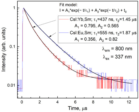 Luminescence decay curves of CsI:Yb,Sm and CsI:Eu,Sm in the emission band under 3.68 eV pulsed laser excitation at room temperature. The black lines represent fitting with a bi-exponential model.