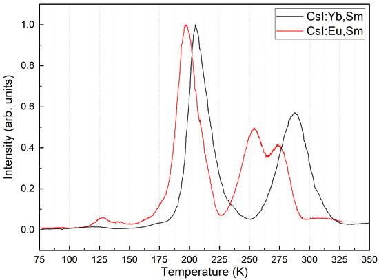 The thermoluminescence glow curves are shown in Figure 12. Weak glow peaks at 125 and 140 K and intense glow peaks at 200, 255, and 275 K were observed in CsI:Yb,Sm crystals. In the CsI:Eu,Sm crystals, peaks at 205 and 290 K were observed.