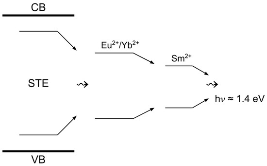 The energy transfer process is associated with the overlap of the emission bands of (Figure 9) and [13] and the absorption characteristics of [14]. When excited in the 4f-5d bands of or , intense luminescence related to is observed, causing the entire volume of the crystal to glow. The intensity of 5d-4f luminescence from increases with rising concentrations of divalent lanthanide ions, as decreasing distances between ions and sensitizer ions ( or ) facilitate energy transfer. Thus, dipole–dipole nonradiative energy transfer from sensitizer ions or to ions presumably occurs (Figure 13).