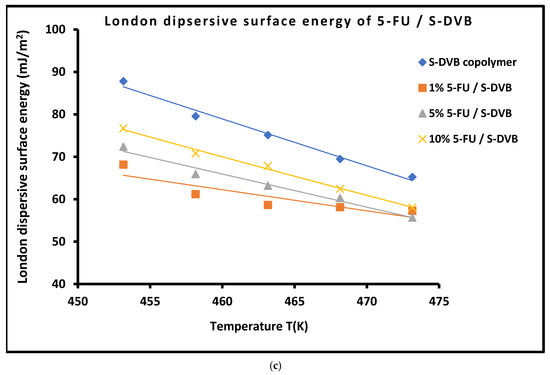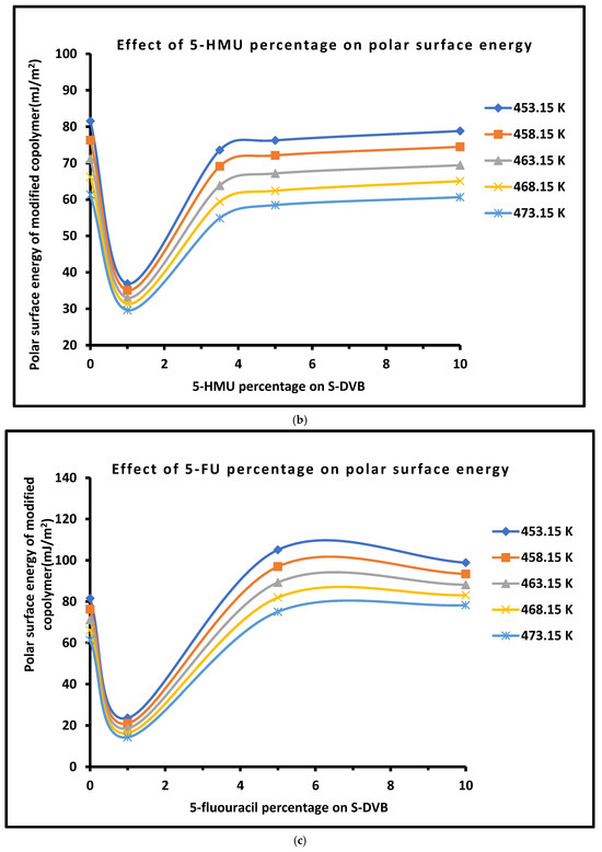 - Surface energy regulation by 5-FU. The incorporation of 5-FU onto the S-DVB surface increases the polar component of the surface energy through hydrogen bonding and dipole interactions. The overall surface free energy due to enhanced molecular heterogeneity also increases and leads to the increased density of functional groups. This results in stronger intermolecular forces with adsorbed molecules (e.g., polar solvents), thus increasing the work of adhesion. This was particularly observed with 5% 5-FU on S-DVB.