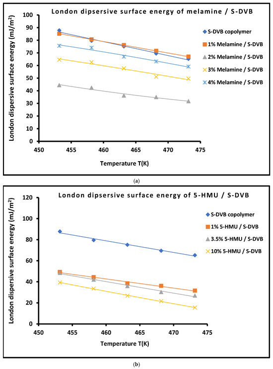 Based on the Hamieh thermal model [26,27,28,29,30,31,32,33,34] and the Fowkes equation [18], the representation of the variations in of n-alkanes adsorbed on the modified copolymers as a function of led to the of the various copolymers versus the temperatures [45,46,47]. The results are plotted in Figure 1, where a decrease in was observed as the temperature increased. The highest London dispersive surface energy was obtained with 1% melamine/S-DVB, closest to the of the copolymer alone, while the lowest values were shown with 10% 5-HMU/S-DVB. An important difference in the of the copolymer behavior was found to be affected both by the modifier and its percentage. Figure 1 clearly shows a decrease in the values of of S-DVB when it was modified by 5-HMU or 5-FU, which is certainly due to the morphology change in the copolymer structure.