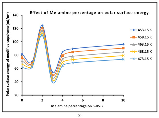 To highlight the effect of the modifier percentage on the of the different modified copolymers, the curves of of solid surfaces are plotted in Figure 2 as a function of the modifier percentage. The variations in for all used modifiers are not linear when the modifier percentage varies. The results show a maximum of at 2% melamine/S-DVB and a minimum at 3% of melamine for all temperatures with a pallier after 4% melamine (Figure 2a). However, a minimum of was observed at 1% of 5-HMU (Figure 2b) and 5-FU (Figure 2c) for the different temperatures, and a pallier shown in Figure 2 after 4% of the modifier on the S-DVB copolymer. The results thus prove that the polar surface energy is strongly affected not only by the temperature but also by both the nature and the percentage of the modifier, as is shown in Figure 3. It seems that the S-DVB copolymer modified by melamine gives the highest at 2% melamine, while the 5-FU on S-DVB exhibits the highest after 4% 5-FU.