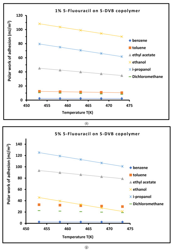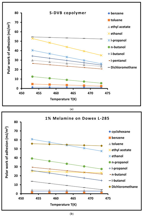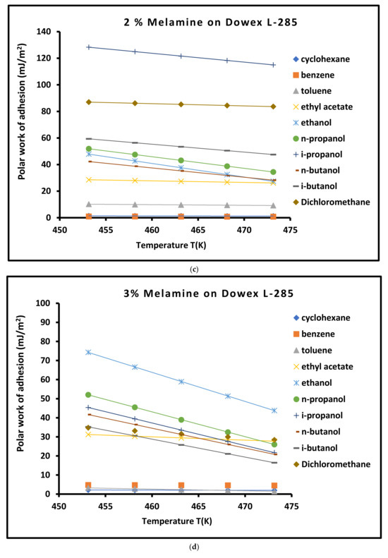 A new method was proposed to determine the variations in the work of adhesion of model organic solvents on S-DVB copolymers modified by melamine, 5-HMU, and 5-FU at different percentages by varying the temperature. The surface properties of modified copolymers such as the dispersive and polar free energy of adsorption and the London dispersive and polar surface energies of copolymers were used to determine the dispersive and polar works of adhesion of the various organic model solvents on S-DVB copolymers as a function of temperature and modifier percentage. Results showed an excellent linearity of and as a function of temperature for all solvents and copolymers, with a decrease in the temperature depending on the modifier’s nature and its percentage. The highest polar adhesion work was obtained with ethanol on S-DVB modified by melamine, while the values of of benzene and toluene were the lowest. The comparison between the various modifiers led to the conclusion that the maximum adhesion work was obtained with 5-FU on the S-DVB copolymer. Indeed, the modification of S-DVB by 5-FU with high-energy interaction sites increases compatibility and adhesion with a wide range of solvents. This shows that the careful selection of modifiers with tailored molecular functionalities can effectively regulate the polar surface energy and adhesion behavior. The work of adhesion was correlated to the surface enthalpy and entropy of organic solvents adsorbed on copolymers at different modifier percentages ( via the following equation: