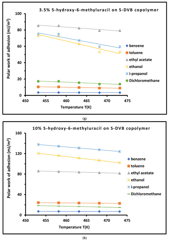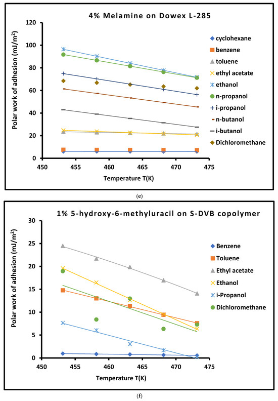 The application of the Hamieh thermal model allowed us to obtain the correct London dispersive surface energy of the S-DVB copolymer, modified, respectively, by melamine [45], 5-hydroxy-6-methyluracil [46], and 5-fluouracil [47], for percentages varying from 1% to 10% and temperatures from 443.15 K to 473.15 K. The new applied methodology led to the separation between the dispersive free energy and the polar free energy of adsorption of the various organic molecules adsorbed on the modified S-DVB copolymer at different temperatures.