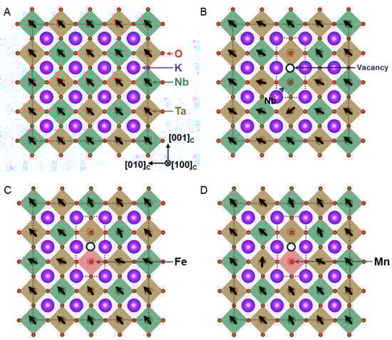 Dipole moment orientations in the KTN octahedra within (100)C sections containing defect dipoles. (A) Pristine KTN lattice, (B) KTN lattice with an oxygen vacancy (VO-KTN), (C) Fe-doped lattice, and (D) Mn-doped lattice. Reproduced from [32] under CC-BY license.