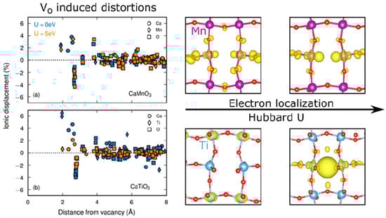 Other classes of perovskite materials, like XGeO3 (X = Sr, Ca), confirmed the general trend, as they also present an important enhancement of their ferroelectric properties by increasing the strain [81]. Chemical expansion can occur in the presence of oxygen vacancies in manganite and titanate perovskites resulting in volume change, which is shown to be linked to Hubbard repulsion in the AMnO3 and ATiO3 (A = Ca, Sr, Ba) systems [82]. Here, using DFT calculations implemented in VASP, the Hubbard term was shown to impact the ionic displacements, as indicated in Figure 2. Furthermore, the interplay between polarization, strain, and defect pairs in Fe-doped SrMnO3−δ showed that polarity and ferroelectricity can be adjusted in nonpolar perovskite oxides [83]. This analysis was performed in the DFT+U framework of Quantum Espresso.