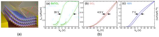 (a) Transistor structure with a MoS2 active layer placed on a BTO ferroelectric substrate. (b) I–V hysteresis curves for different substrates (BTO, Si, hBN) outlining the role of the ferroelectric material. Reprinted from [99] under CC-BY 4.0 license.