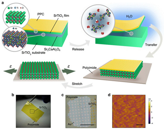 (a) Schematic illustrating the lift-off and transfer process for SrTiO3 membranes onto polyimide sheets. By dissolving the sacrificial Sr2CaAl2O6 layer from the as-grown heterostructure, SrTiO3 films can be released and transferred onto a polyimide sheet with a layer of polypropylene carbonate (PPC) as the supporting material. The oxide/polymer bilayer structure can be stretched after PPC is thermally decomposed in O2. Optical images of the transferred millimeter-scale freestanding SrTiO3 membranes are shown in (b,c), with an ordered array of gold optical markers. The scale bar is 1 mm. (d) Detailed atomic force microscopy topographic images reveal the crack-free surface of SrTiO3 transferred onto the polyimide sheet. The scale bar is 1 µm. Reprinted from [107] under CC-BY license.