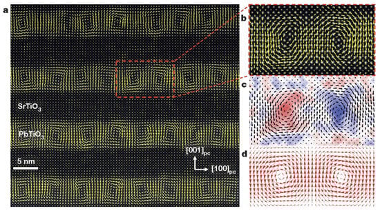 While studying PTO/STO multilayers grown on tensile strain-inducing GdScO3, Tang et al. found huge strain gradients of up to 109 m−1 in periodic arrays of flux closures, with periods depending on the PTO layer thickness [115]. Later, long-range vortex–antivortex arrays were obtained in PTO/STO superlattices, as shown in Figure 6, and proven to be the ground state of the system for a range of sublattice periods through phase-field simulations [116]. Growing the superlattice on STO led to the first observation of three-dimensional polar skyrmions, and second-principles calculations were used to model the microscopic polarization structure and calculate the characteristic skyrmion number [117]. Tensile strain and poor screening of polarization were shown through experimental investigations and phase-field modeling to lead to the formation of large curvature layers of up to 107 m−1 in PTO/SRO and optically excited PTO/STO superlattices. Moreover, subterahertz collective dynamic modes were observed in such superstructures through both experiments and modelling, with dynamic phase-field modeling predicting the tunability of the vortexon mode by electric fields at room temperature [118]. Other structures such as merons formed in thin PTO films deposited on SmScO3 substrates, with phase-field simulations showing that they can be synthesized through careful manipulation of strain and electric boundary conditions [119]. Incommensurate spin crystals were later proved to also form in ferroelectrics [120], with possible Dzyaloshinskii–Moriya interaction (DMi) electric equivalents, such as oxygen octahedral tilting trilinear interactions with different possible cationic modes, previously explored through DFT calculations [121]. Recently, new strain states have been observed in twisted bilayer BTO membranes, leading to a highly correlated topological pattern with vortices and antivortices, which can be tuned by controlling the twisting angle [95].