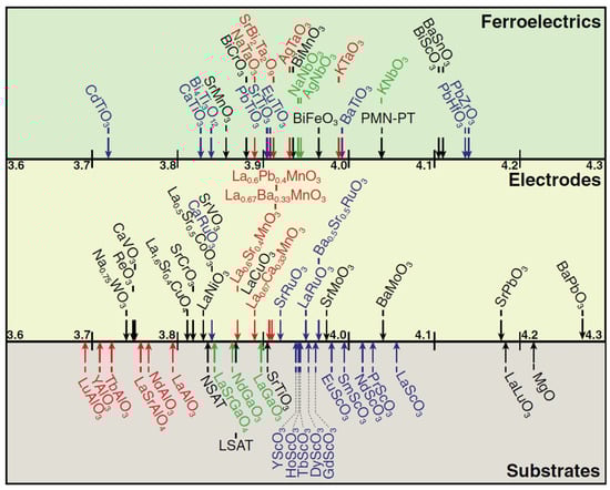 List of commercially available substrate materials (bottom section) and select lists of perovskite electrode materials (middle section) and ferroelectric, incipient ferroelectric, and anti-ferroelectric materials. Reprinted from [164], copyright 2016, with permission from IOP Publishing.
