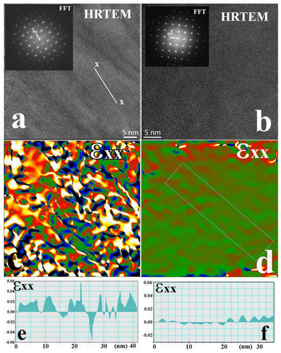 Comparative analysis of Y-BFO–BFO films: HRTEM and FFT (a,b), stress/strain GPA maps (c,d), and line profiles of the strains (e,f). Reprinted from [3], under CC-BY license.