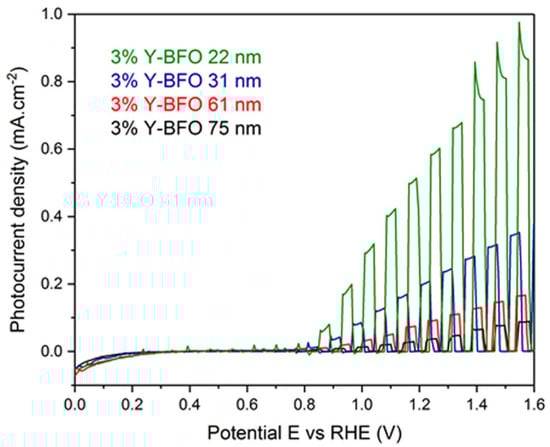 PEC potentiodynamic measurements for Y-BFO thin films with different thicknesses performed at different E(V) vs. RHE. Reprinted from [18], under CC-BY license.
