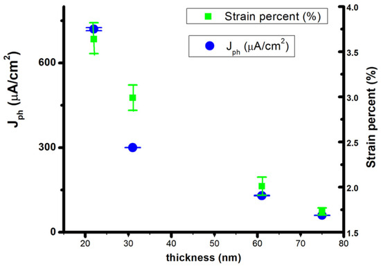 The photocurrent density Jph values in Y-BFO films with different induced strain levels. Reprinted from [18], under CC-BY license.