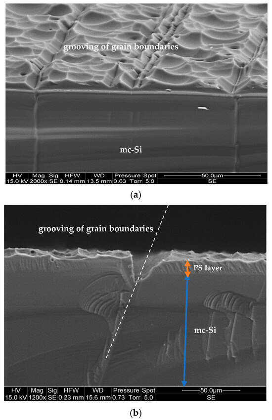 SEM images of mc-Si after grain boundary (GB) grooving (a) with and (b) without PS treatment.