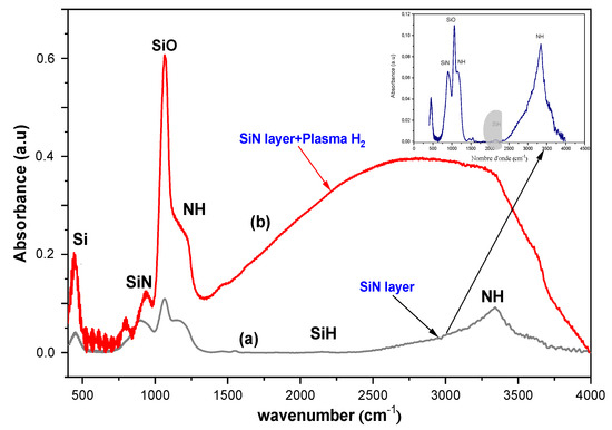 FTIR spectrum of (a) SiNx layer and (b) H2 plasma-treated samples via PECVD.