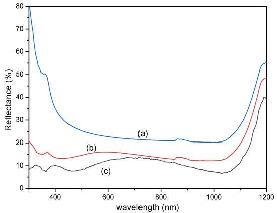 Total reflectivity of (a) bare mc-Si, (b) T-mc-Si, and (c) T-mc-Si with H2/SiNx.
