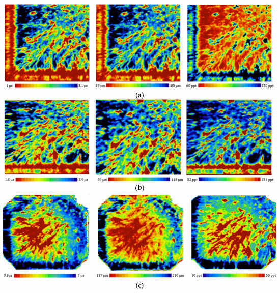 Another critical phenomenon examined in this study is the impact of the T-mc-Si on the edge regions of the mc-Si wafers. As shown in Figure 6b, the carrier lifetime mapping of the mc-Si wafers (10 cm × 10 cm), measured using the µ-PCD technique, indicates that the wafers were extracted from the edge of the mc-Si ingot, where the effective minority carrier lifetime (τeff) exhibits a pronounced reduction, particularly along the left and lower edges. Figure 6a shows that the region with a very low τeff (~1 µs) extends approximately 0–15 mm from the wafer edge and gradually increases between 15 and 100 mm.
