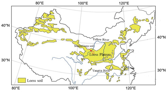 Loess, a wind-deposited aeolian silt with a global distribution, spans vast continental regions and plays a pivotal role in sustaining ecosystems and human infrastructure. In China, the Loess Plateau, a nearly continuous loess-dominated region spanning approximately 630,000 km2, as illustrated in Figure 1, exemplifies its geological and ecological significance [1]. Characterized by its loose, porous structure and sensitivity to water, loess is inherently prone to hydro-mechanical instability, manifesting as catastrophic collapse, erosion, and landslides under environmental stressors [2,3,4,5]. These vulnerabilities pose significant risks to infrastructure and agricultural productivity, particularly in arid regions where loess serves as the primary substrate for human activity. Conventional stabilization methods, such as cement-based solidification and chemical grouting, have long been employed to mitigate these risks. However, their reliance on energy-intensive processes and non-renewable materials raises concerns about long-term ecological sustainability, including soil degradation and groundwater contamination [4,5,6].