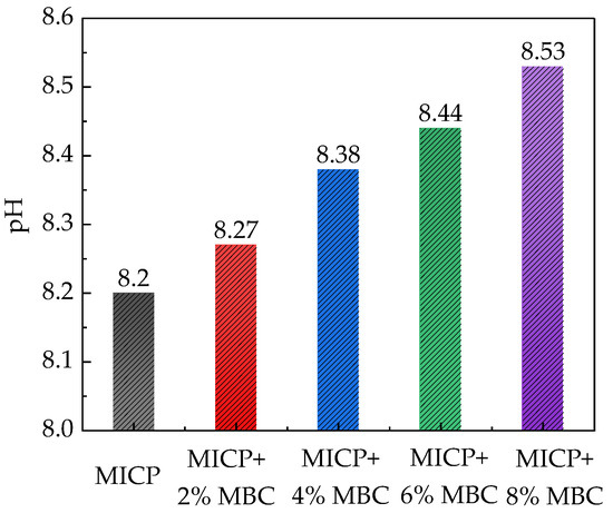 Soil pH critically governs microbial activity and carbonate mineralization during MICP. As shown in Figure 3, MBC amendment induced a dose-dependent pH increase from 8.2 (untreated loess) to 8.53 (8% MBC). This alkalization arose from three synergistic mechanisms. First, alkaline minerals such as calcium oxide and potassium oxide within MBC released hydroxyl ions, neutralizing soil acidity. Second, microbial urea hydrolysis by S. pasteurii ATCC 11859 generated carbonate and ammonium ions, amplifying alkalinity. The calcium carbonate precipitation mechanism observed in this study aligns with previous reports using the analogous strain S. pasteurii DSM 33 under similar biocementation conditions [31]. Notably, our integration of modified biochar appears to enhance crystal nucleation patterns when compared with S. pasteurii DSM 33-based approaches [31], suggesting potential synergistic effects between microbial activity and carbonaceous substrates in loess modification. Third, MBC’s cation exchange capacity immobilized acidic ions, including aluminum and hydrogen, suppressing acidification. The pH range of 8.2 to 8.53 optimized calcite precipitation while sustaining microbial viability, avoiding both undersaturated conditions (pH < 8) and inhibitory alkalinity (pH > 9). Enhanced pore filling by calcium carbonate, facilitated by MBC’s nucleation sites, correlated with pH elevation, directly improving shear strength (52% increase) and carbonate content (38% increase). These results demonstrate that MBC integration refines the biogeochemical niche for MICP, enabling efficient soil stabilization without compromising microbial functionality.