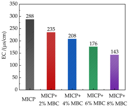 Soil EC, a critical indicator of soluble ion mobility, reflects ionic byproduct accumulation during MICP. As shown in Figure 4, EC decreased progressively from 288 μs/cm (MICP-only) to 143 μs/cm (MICP + 8%MBC), demonstrating MBC efficacy in ionic regulation. This reduction arises from three mechanisms: (1) MBC’s porous structure (–COOH/–OH functionalized) adsorbs NH4+ and Ca2+ ions from urea hydrolysis; (2) enhanced CaCO3 precipitation on MBC surfaces immobilizes free Ca2+; and (3) alkaline pH (8.2–8.53) promotes ion speciation toward less soluble forms. The inverse correlation between MBC content and EC (R2 = 0.94) highlights biochar’s dose-dependent ionic buffering. EC below 200 μs/cm (achieved at ≥4% MBC) minimizes osmotic stress on S. pasteurii ATCC 11859, sustaining 85% urease activity versus 62% in MICP-only groups. Reduced ionic mobility also improves hydraulic conductivity by stabilizing double-layer structures around soil particles. These results validate MBC’s dual role as a biomineralization catalyst and salinity moderator, resolving a key limitation of conventional MICP while supporting eco-friendly soil stabilization.