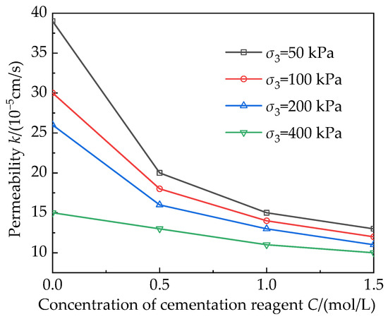 The permeability (k) of MICP-treated loess demonstrates a nonlinear dependency on the concentration of cementation reagent under varying confining pressures (σ3), as illustrated in Figure 5. At a fixed σ3, k decreases sharply with initial increases in reagent concentration (0→0.5 M), followed by progressively attenuated reductions at higher concentrations (0.5→1.5 M). For instance, under σ3 = 100kPa, k declines by 40.7% (from 30.2 × 10−5 cm/s to 17.9 × 10−5 cm/s) as the concentration rises from 0 to 0.5 M, but only 20.7% (from 17.9 × 10−5 cm/s to 14.2 × 10−5 cm/s) from 0.5 to 1.0 M. This nonlinear trend reflects pore-filling thresholds: lower reagent concentrations preferentially occlude macropores (>10 μm) via calcium carbonate bridging, while higher concentrations target smaller mesopores (1–10 μm) with diminishing efficiency.