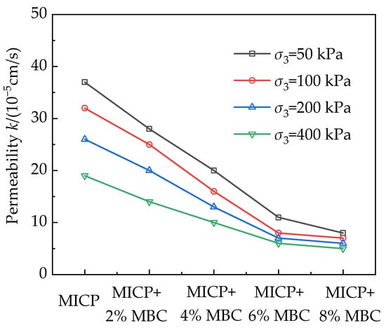 The permeability (k) of MICP-treated loess demonstrates a nonlinear reduction with increasing MBC content under varying confining pressures (σ3), as shown in Figure 6. At fixed σ3, k decreases sharply with MBC addition up to 6% (w/w), followed by diminishing improvements at higher dosages (6–8%). For instance, under σ3 = 200 kPa, k declines by 49.2% (from 25.8 × 10−5 cm/s to 13.9 × 10−5 cm/s) at 4% MBC and further reduces to 6.1 ×10−5 cm/s (76.4% reduction) at 8% MBC. This trend reflects two distinct phases: (1) rapid pore occlusion (0–6% MBC), where biochar’s high surface area and hydroxyl/carboxyl functional groups enhance CaCO3 nucleation and macropore (>10 μm) filling and (2) saturation-limited refinement (6–8% MBC), where excessive MBC agglomeration restricts reagent diffusion into micropores, limiting additional permeability reduction.