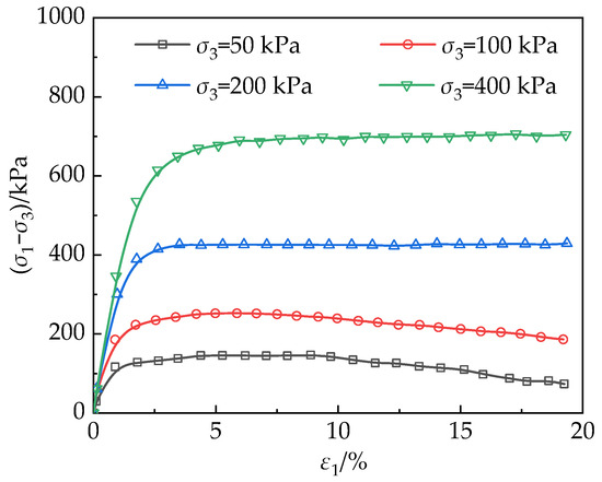 Deviatoric stress–strain curves of untreated loess under varying confining pressures.