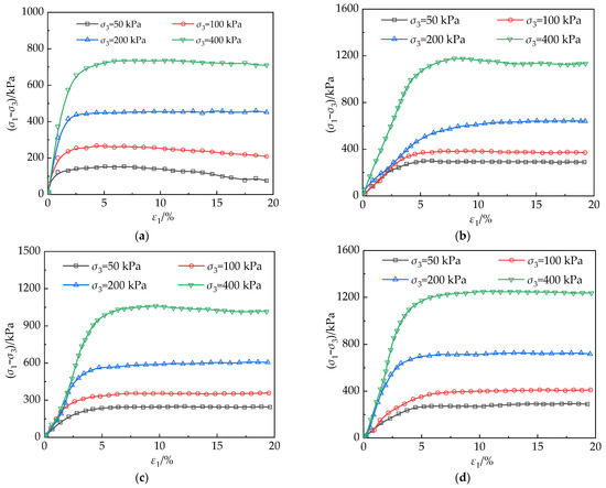 Stress–strain relationships of MICP–MBC modified loess: (a) 2%MBC (C = 0.5 mol/L); (b) 6%MBC (C = 0.5 mol/L); (c) 2%MBC (C = 1.0 mol/L); (d) 6%MBC (C = 1.0 mol/L).