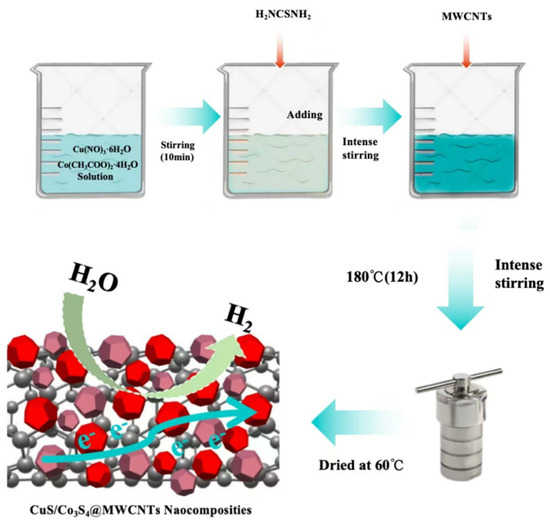 Presently, numerous earth-abundant materials are under development to address these challenges. For instance, metal sulfides [5,6,7,8,9,10], carbides, nitrides, and phosphates [11,12,13] have demonstrated considerable potential, particularly in the realm of electrocatalytic water decomposition, enhancing HER performance through augmentation of the active site and enhancement of electrical conductivity on metal surfaces. The discovery and subsequent development of these materials offer novel methodologies for surmounting challenges associated with the conversion and storage of renewable energy [14,15,16]. The cost-effectiveness and robust stability of these materials render them highly appealing for industrial applications. Amid the array of materials, sulfides stand out as an economical and environmentally benign HER catalyst, attributed to their high specific capacitance, low cost, and superior catalytic efficacy [17,18]. Compared with other metal sulfides, Co3S4 has gained widespread usage owing to its affordability and high stability [19,20]. In particular, the integration of carbon-based materials into sulfides enhances their conductivity and HER activity. Carbon nanotubes (CNTs), graphene (G), and graphene oxide (GO) have recently been demonstrated to be efficacious materials [21,22,23], characterized by their high specific surface area, which in turn enhances the stability and dispersion of the catalytic active sites. Consequently, the enhancement of ion transport dynamics is accompanied by the formation of additional layered porous channels and the provision of enhanced structural mechanical stability. Nonetheless, the literature is sparse regarding supercapacitors constructed through the loading of monometallic sulfides onto carbon nanotubes [24,25,26]. For instance, Wu et al. [24] successfully synthesized NiFe-NGT nanocomposites under a nitrogen atmosphere via a high-temperature annealing method. In this work, a precisely controlled temperature program was employed to facilitate the formation of uniformly dispersed active sites within a nitrogen-doped carbon matrix. As a novel non-precious metal electrocatalyst, it exhibits remarkable HER activity and long-term stability in acidic environments. Nevertheless, this synthesis approach also has notable limitations: firstly, the high-temperature heat treatment process (>700 °C) results in a substantial increase in energy consumption and production costs; secondly, the stringent requirement for an inert atmosphere and the complexity of temperature control procedures escalates operational difficulty, which is not conducive to large-scale production. Moreover, high-temperature conditions may induce the sintering of metal particles and affect the graphitization degree of carbon supports. Therefore, to enhance the catalytic efficiency of the electrocatalyst by integrating elements with similar charge and lattice size, and to elucidate the electronic interactions between metal ions in the alloy sulfide structure, it is crucial to develop a simple, low-temperature, and cost-effective synthesis method. The integration of elements possessing analogous charges and lattice dimensions has the potential to enhance the catalytic efficacy of electrocatalysts. Consequently, a comprehensive understanding of the electronic interactions occurring between metal ions within the alloyed sulfide structures is essential for the realization of superior electrocatalytic performance. Thus, the primary objective of this investigation is to dope bimetallic sulfides with MWCNTs to synthesize an advanced electrocatalyst for the HER. This approach is anticipated to yield a composite material with enhanced catalytic activity, thereby contributing to the advancement of sustainable hydrogen production technologies.