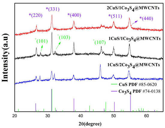 XRD patterns of 1CuS/1Co3S4@MWCNTs, 1CuS/2Co3S4@MWCNTs, and 2CuS/1Co3S4@MWCNTs (Purple * represents Co3S4 crystal plane, green * represents CuS crystal plane).
