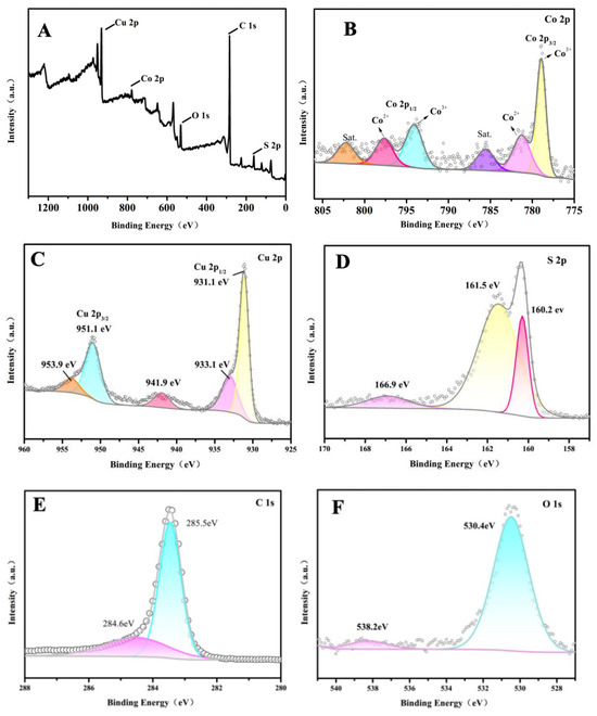 XPS spectra of 2CuS/1Co3S4@MWCNT composite: (A) survey; (B) high-resolution XPS spectra of Co 2p3; (C) Cu 2p; (D) S 2p; (E) C 1s; and (F) O 1s.