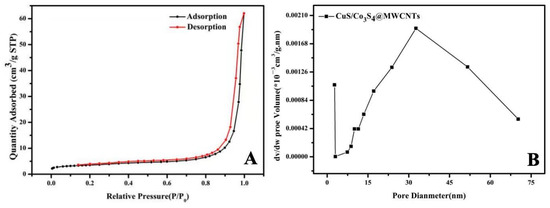 (A) Nitrogen adsorption-desorption isotherm curve for the CuS/Co3S4@MWCNT composite; (B) pore size distribution curve of the CuS/Co3S4@MWCNT composite.