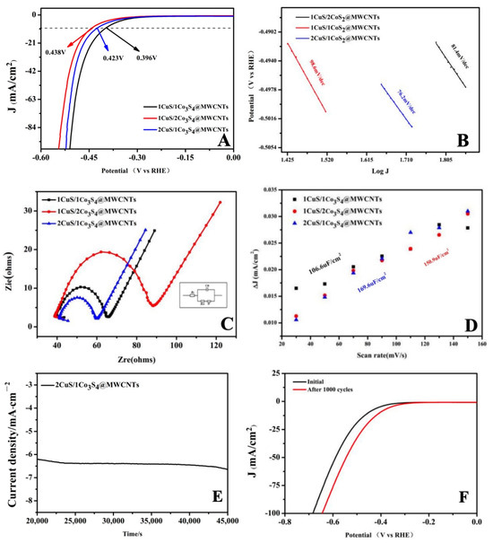 (A) Polarization curves of the CuS/Co3S4@MWCNT composite with different metal ratios in 1.0 M N2–purged KOH solution; (B) Tafel slopes of different catalysts derived from the polarization curves; (C) ESI of catalysts in a 0.5 mM impedance solution; (D) linear fitting for the capacitive currents of the catalyst vs scan rates; (E) i−t curve obtained under a static overpotential of −1.3 V; (F) HER polarization curves before and after 1000 cycles for the 2CuS/1Co3S4@MWCNT composite modified.