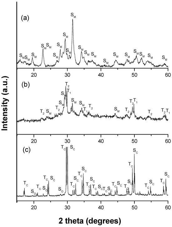 XRD patterns were collected using a D8 Advance diffractometer (Bruker, Bremen, Germany) with the CuKα radiation in the Bragg–Brentano configuration. The generator was set up at 40 kV and 40 mA. The divergence and receiving slits were 0.3° and 0.1 mm, respectively. The XRD patterns were recorded in the range of 10–60° 2θ with a step of 0.03°. For phase identification, Diffracplus Eva and the ICDD PDF2 database were utilized [38].