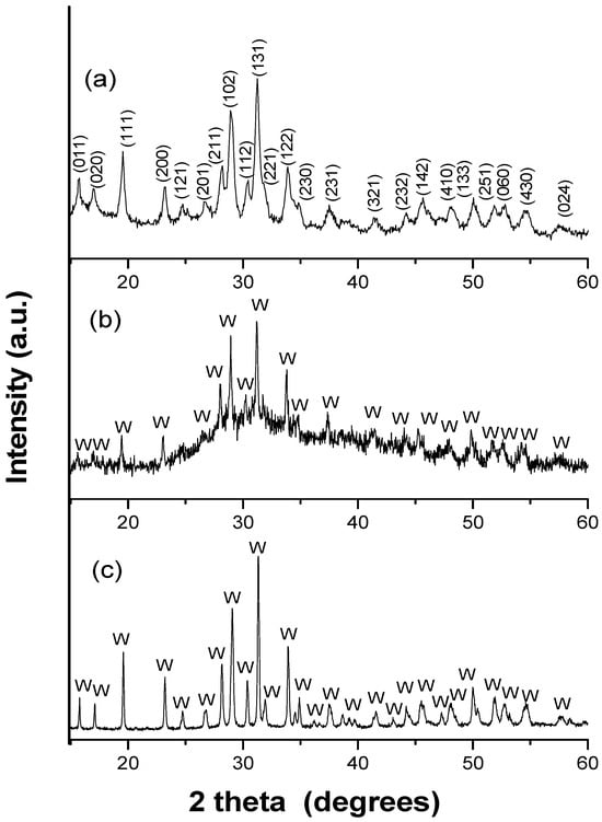 XRD patterns of wittichenite Cu3BiS3 (a)—mechanochemically synthesized after 5 min of milling, (b)—after thermal treatment up to 773 K, and (c)—after spark plasma sintering at 723 K. Miller indices labelled in (a) correspond to orthorhombic wittichenite Cu3BiS3. The identified phase, orthorhombic wittichenite in (b,c), is marked as W.