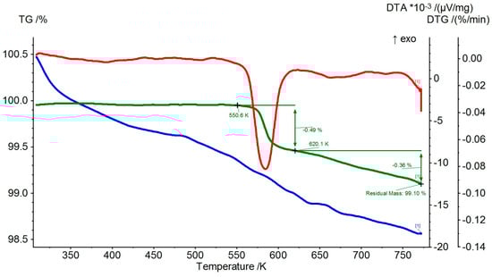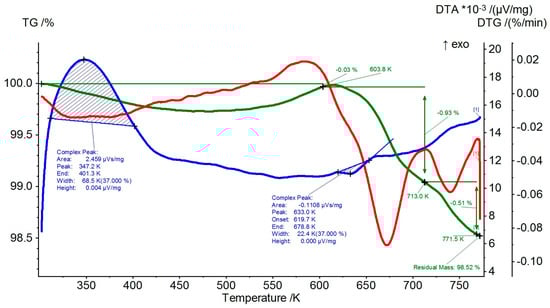 The thermal behavior of samples was investigated by thermogravimetric/derivative thermogravimetric/differential thermal analysis (TG/DTG/DTA) using Netzsch STA 449 F3 Jupiter (Netzsch, Germany). A homogenized sample (100 mg) was placed into an Al2O3 crucible, and the reference crucible was empty. The sample was subjected to linear heating at 5 K/min under a dynamic argon atmosphere (Ar purity ≥ 99.999 vol%) with a constant flow (60 mL/min) in a temperature range from 299 K to 773 K.